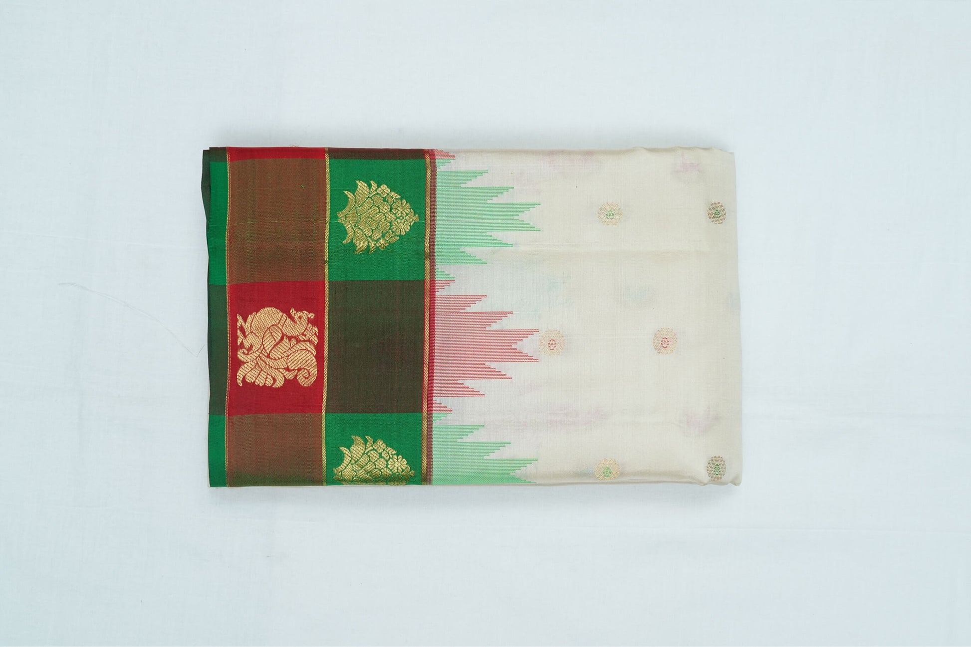 Kanchipuram Silk Saree - Off-White with a Checked peacock design border