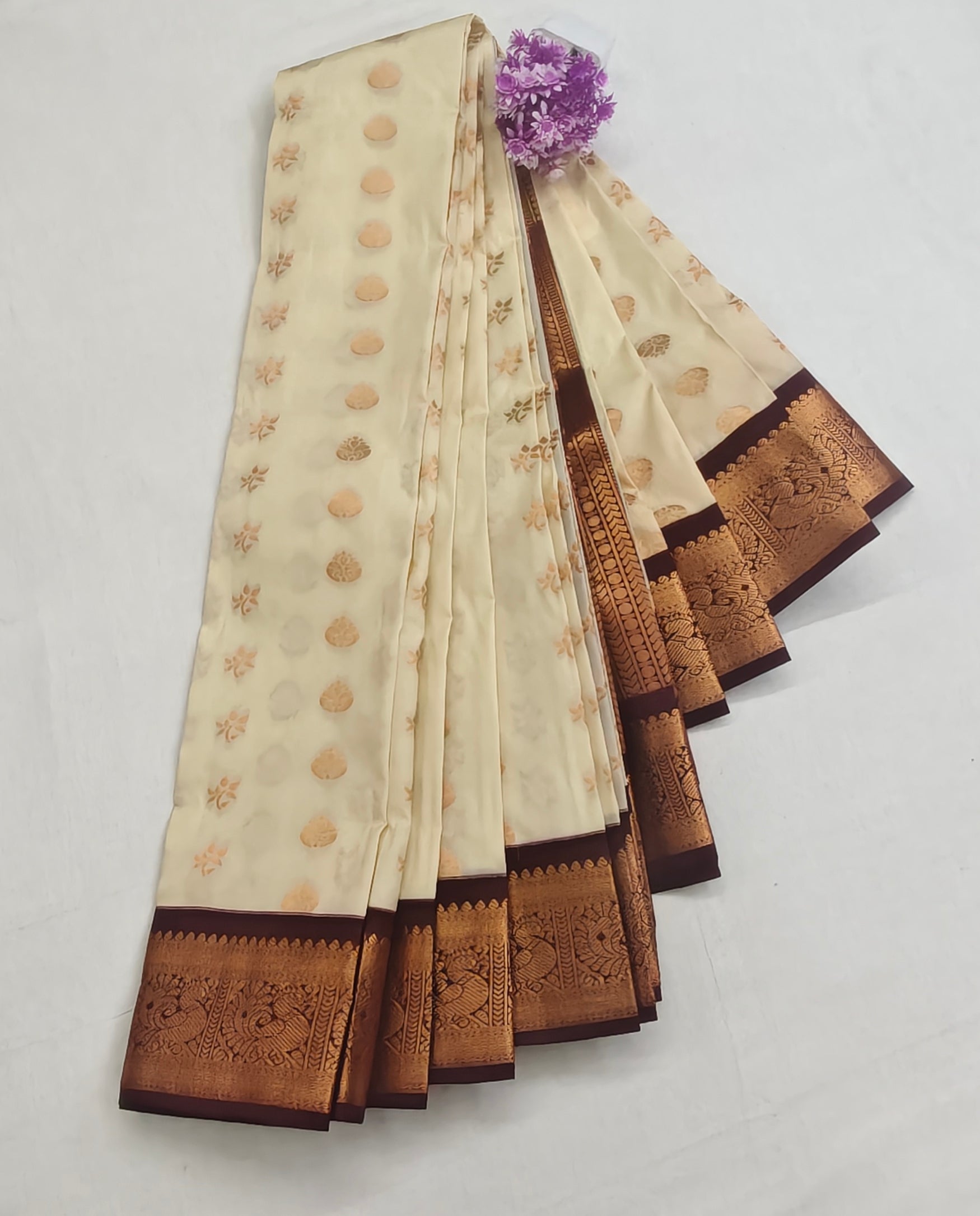 Kanchipuram Semi Silk Saree - Off-White with Brown Peacock Design Border